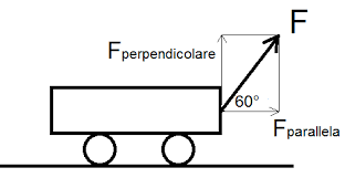Osservando la figura sottostante, si nota come la forza "F" possa essere scomposta in due componenti, una parallela al piano di appoggio (che contribuisce al moto) ed una perpendicolare (che non contribuisce al moto, perché verticale e perfettamente equilibrata dalla reazione vincolare del piano).