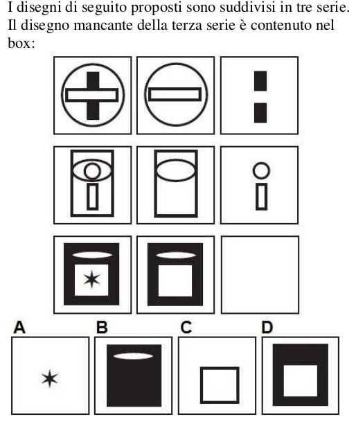 In conclusione, si intuisce chiaramente che il disegno mancante della terza serie è contenuto nel box indicato con la lettera A, in quanto la stellina è l'unico elemento NON in comune tra i primi due disegni della serie (vedi figura sottostante):