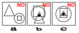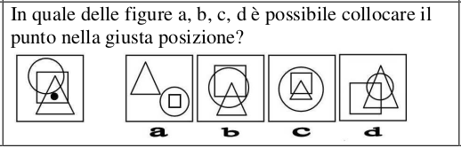Al contrario, nelle figure a, b e c non si riescono a rispettare gli stessi criteri. Infatti, nella figura a non esiste alcuna area di intersezione tra triangolo e quadrato, mentre nelle figure b e c, collocando il punto sia nel triangolo che nel quadrato, esso si trova contemporaneamente anche nel cerchio (vedi figura sottostante):