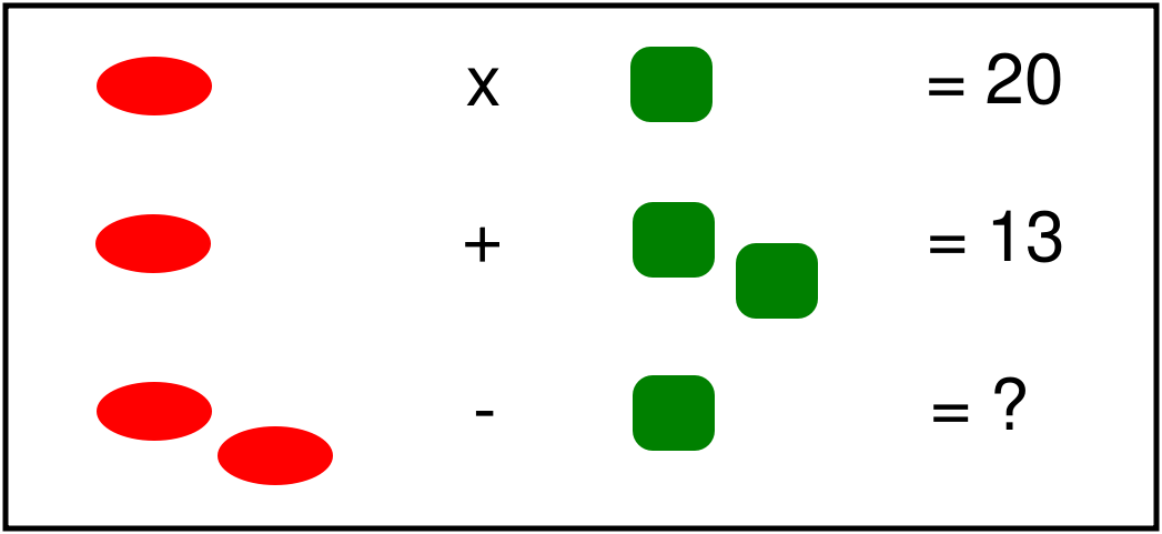 Nella matrice proposta, sono presenti tre equazioni lineari in cui, per identificare il numero incognito "?", bisogna innanzitutto capire a quali numeri corrispondono i simboli geometrici presenti (ovale e quadrato nel caso in esame). I 2 simboli geometrici, essendo diversi tra loro, devono necessariamente equivalere a numeri tra loro differenti.