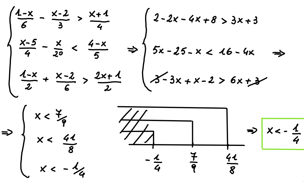 Traccia: Risolvere il seguente sistema di disequazioni: (1 - x)/6 - (x - 2)/3 > (x + 1)/4; (x - 5)/4 - (x/20) < (4 - x)/5; (1 - x)/2 + (x - 2)/6 > (2x + 1)/2. [risposte: a) x < -1/4; b) x > 1/4; c) -1/4 < x < 1/4; d) è impossibile]