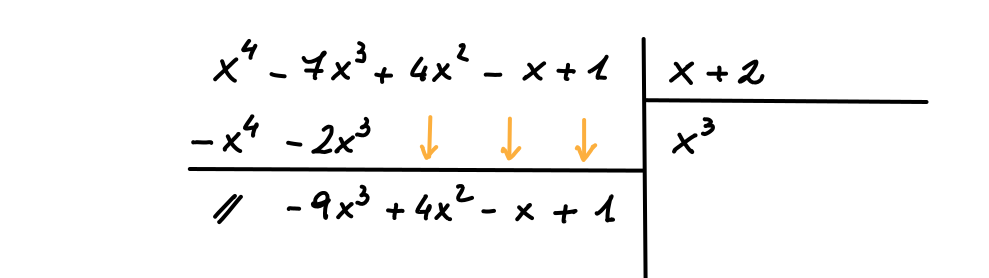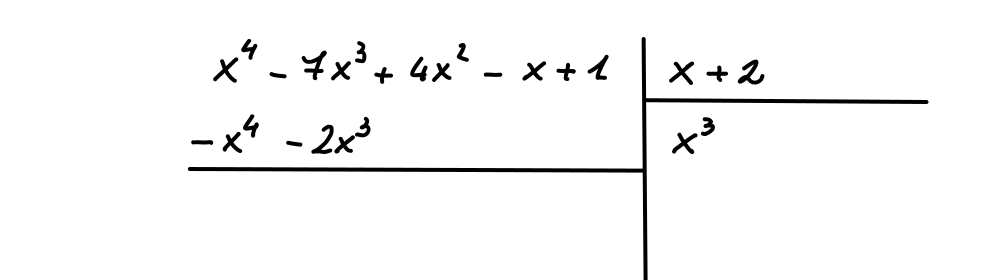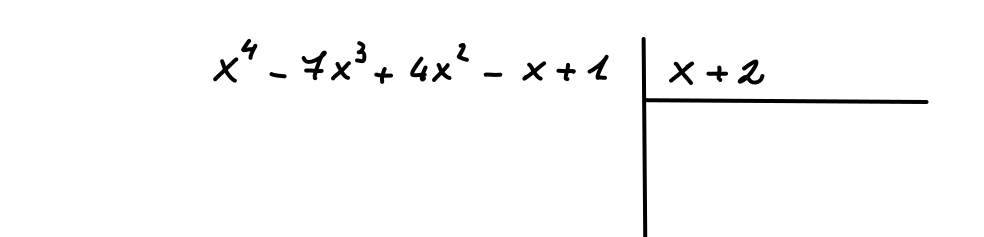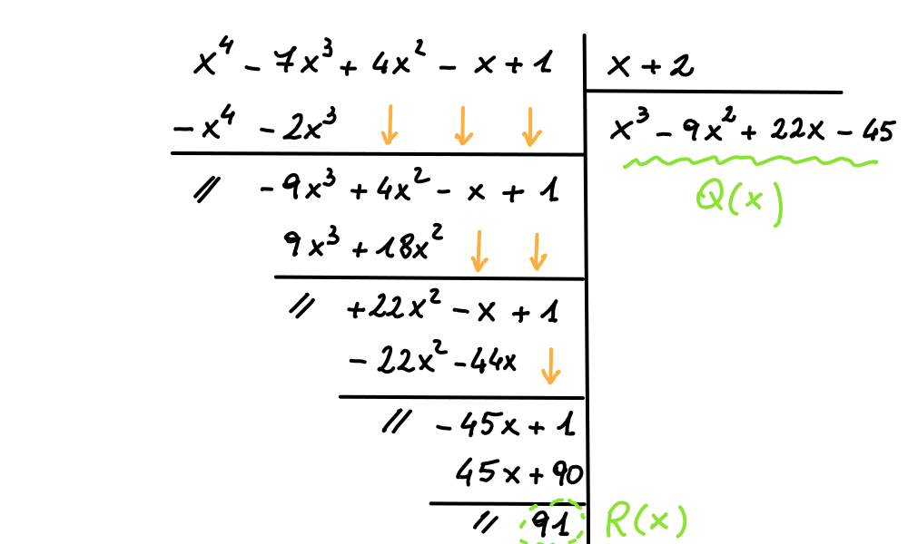 Traccia: Determinare il quoziente e il resto della seguente divisione tra polinomi: (x4 - 7x3 + 4x2 - x + 1):(x + 2). [risposte: a) quoziente: x3 + 9x2 + 22x - 25, resto = 91; b) quoziente: x3 - 9x2 + 22x - 25, resto = -25; c) quoziente: x3 - 9x2 + 22x - 45, resto = 91; d) quoziente: x3 + 9x2 + 22x - 25, resto = -25 ]