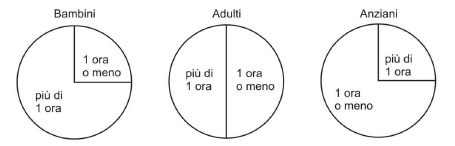 Lo scorso sabato 40 bambini, 100 adulti e 60 anziani sono andati in piscina. Per stabilire quanto tempo ciascun utente è rimasto in acqua è stato effettuato un sondaggio, i cui risultati sono riportati nei seguenti grafici:
