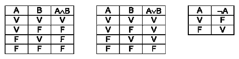 Le tavole di verità sono tabelle usate nella logica per determinare se, attribuiti i valori di verità alle proposizioni che la compongono, una determinata proposizione è vera o falsa. Le tabelle di verità della congiunzione “e” (∧), della disgiunzione “o” (∨) e della negazione “non” (¬) sono rispettivamente: