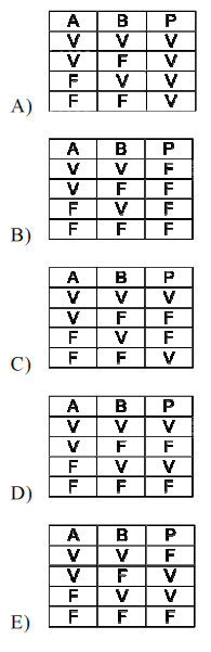 - quarta riga: "A" e "B" sono false → dalla quarta riga della "tabella A∧B" si ha che "A∧B" è falsa, quindi "non (A∧B)" è vera → poichè "non (A∧B)" è vera e "A" è falsa → dalla seconda riga della "tabella A∨B" si ha che "P" è vera. La quarta riga è quindi corretta.