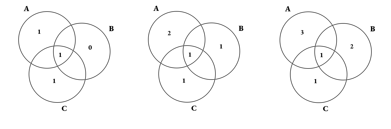 - nell'intersezione dei 3 insiemi (A ∩ B ∩ C) vi è 1 solo elemento;