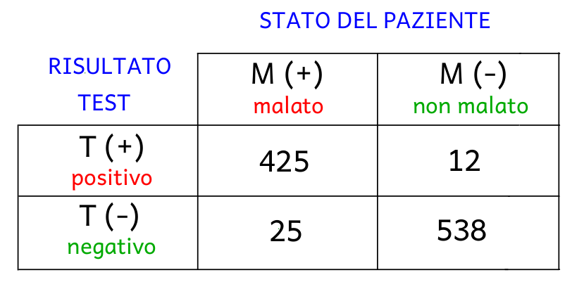 - falsi positivi (FP): numero di individui sani (non malati) e positivi al test;