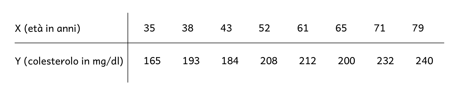 Nella tabella seguente vengono raccolti i dati dell'età (variabile X) e dei valori di colesterolo nel sangue (variabile Y) di 8 individui: